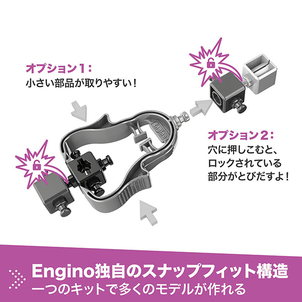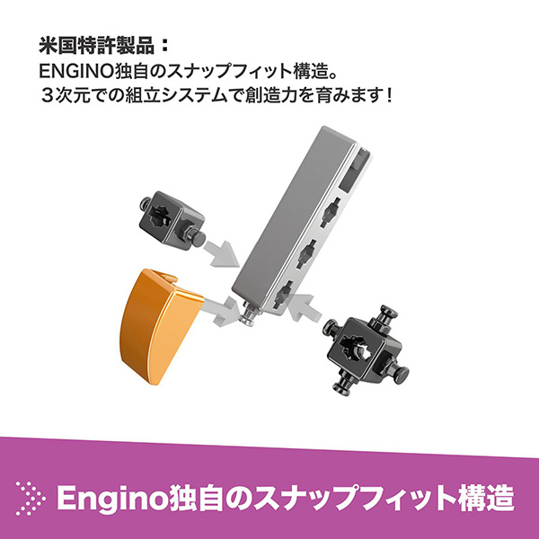 米国特許を取得した、あらゆる方向から3Dでの組み立てができる独自のスナップフィット構造を採用。従来のブロックの縦や横への取り付けに加え、伸縮したり、可動域を与えたりといった、柔軟な設計を可能にします。複雑な構造も再現しやすく本格的な模型作りができるほか、お子さまの創造力で説明書にないものを自由に作り上げることができる、エンジニアリングに特化したブロックです。