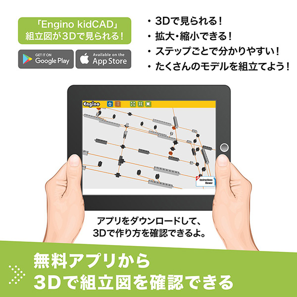 「ヘリコプター」「ショベルカー」「ダンプカー」「トラック」「飛行機」「クレーン」「風車」「スポーツカー」など、合計30種類もの乗り物の模型を作ることができます。本品付属のガイドブックで4種類、ウェブサイト、または専用アプリ「EnginoKidCAD」で全種類の組み立て方法が確認できます。Engino独自のスナップフィット構造で自由度の高い組み立て方が可能なので、1個のキットでも長くお楽しみいただけます。