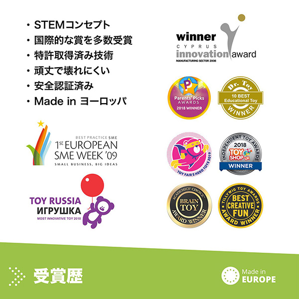 「好き」を見つけて「得意」を育むSTEAM玩具です。複数モデルから好きな形を見つけて組み立てる過程で、空間認識能力はもちろんのこと創造力や集中力が育まれます。実際に手を動かしてモノを作り、試行錯誤するプロセスを学習の中核に置く新しい教育モデルである、STEAM学習の入門におすすめです。自ら楽しみながら学ぶ、今の時代に必要とされている「学び方」を実践しましょう。