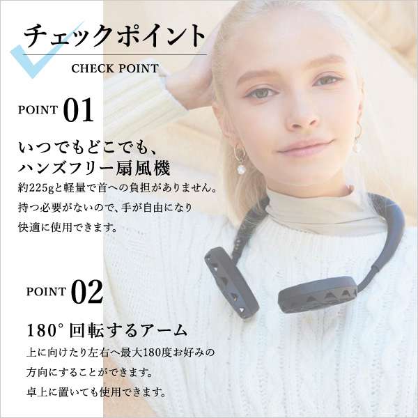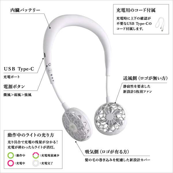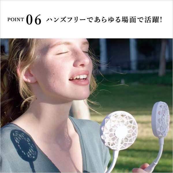暑い時、暑い場所でいつでもどこでも、首にかけるだけの携帯用扇風機です。