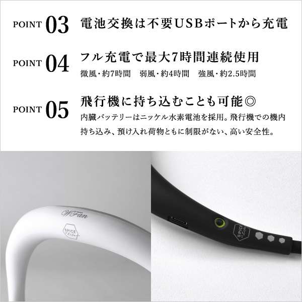充電に簡単で便利なUSBポートから充電。面倒な電池交換は不要です。フル充電で最大7時間連続使用ができます。(微風/約7時間 弱風/約4時間 強風/約2.5時間)