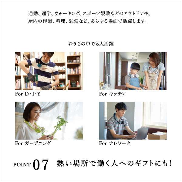 真夏のフェスやアウトドア、スポーツ観戦、散歩、山登り、遠足、お祭りや日常生活でのガーデニング、お風呂上り、お化粧時、家事の時、通勤、通学、オフィスなどあらゆる場面で熱中症対策に活躍するアイテムです。