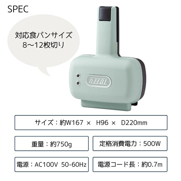 | その他スペック | ■対食パンサイズ:8〜12枚切り ■素材:スチール ■電源:AC100V 50-60Hz ■定格消費電力:500W ■電源コード長:約0.7m |