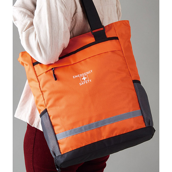 肩掛けトートも出来る2WAY仕様の避難用リュックに、各種防災グッズをセット。軽量・口広ファスナーで中に入っている物の取り出しもスムーズ。家庭や職場の備えに最適です。