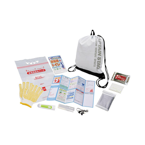 | 内容 | ナップサック(約450×340mm)×1、非常用給水バッグ(3l)・ハンディライト・非常用トイレ・防寒シート・ポケットティッシュ(8W)・すべり止め手袋・防災ガイド・防災用ウエットティッシュ(20枚)・コンパクトFMラジオ×各1 |