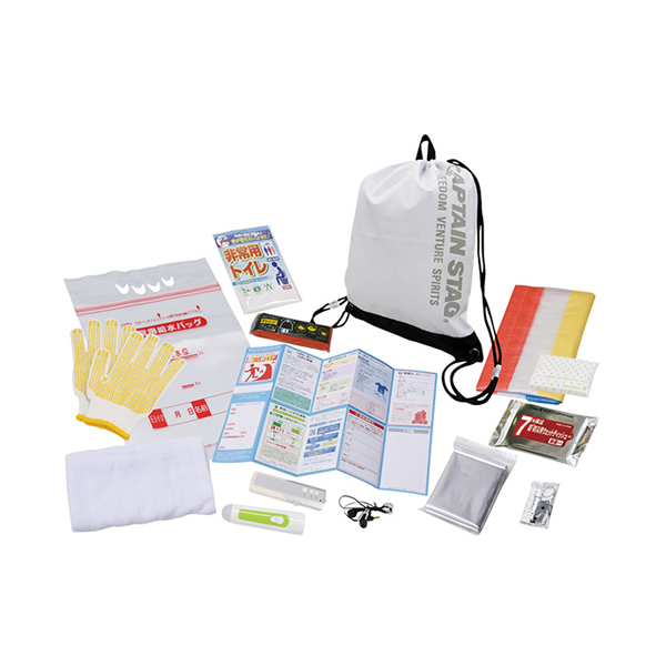 | 内容 | ナップサック(約450×340mm)×1、非常用給水バッグ(3l)・ハンディライト・非常用トイレ・防寒シート・ポケットティッシュ(8W)・すべり止め手袋・防災ガイド・防災用ウエットティッシュ(20枚)・コンパクトFMラジオ・レジャーシート・レインポンチョ・タオル・緊急用ホイッスル×各1 |