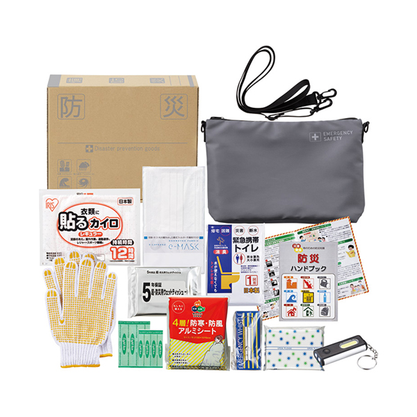 | 内容 | サコッシュバッグ(約182×287×45mm)×1、2WAYフラットライト・ホイッスル・軍手・使い捨てカイロ・防寒アルミシート・ウェットティッシュ(20枚)・携帯トイレ(大小兼用)(1P)・ポケットティッシュ・エイトバン(大小×各2)・防災ハンドブック・マスク×各1 |