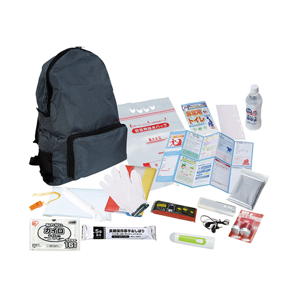 | 内容 | 携帯リュック(約420×320×150mm)×1、ハンディライト・防寒シート・防災ガイド・レインポンチョ・長期保存厚手おしぼり(大判)・非常用給水バッグ(3l)・軍手・ロープ(3m)・笛・マスク・カイロ・非常用トイレ・コンパクトFMラジオ・レジャーシート・非常用ローソクセット・タオル・保存水(500ml)×各1 |