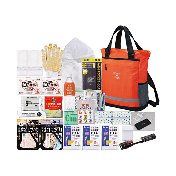 | 内容 | 2WAYリュック(約130×300×400mm)×1、COB伸縮2WAYライト・ホイッスル・モバイルチャージャー(乾電池式)・ウェットティッシュ(20枚)・軍手・防寒アルミシート・レインコート・エイトバン(大小×各2)・防災ハンドブック・長期保存ボディタオル・携帯おにぎり(鮭)・携帯おにぎり(昆布)・備蓄用飲料水(500ml)×各1、使い捨てカイロ・ポケットティッシュ・マスク×各2、携帯トイレ(大小兼用)(1P)×3 |
