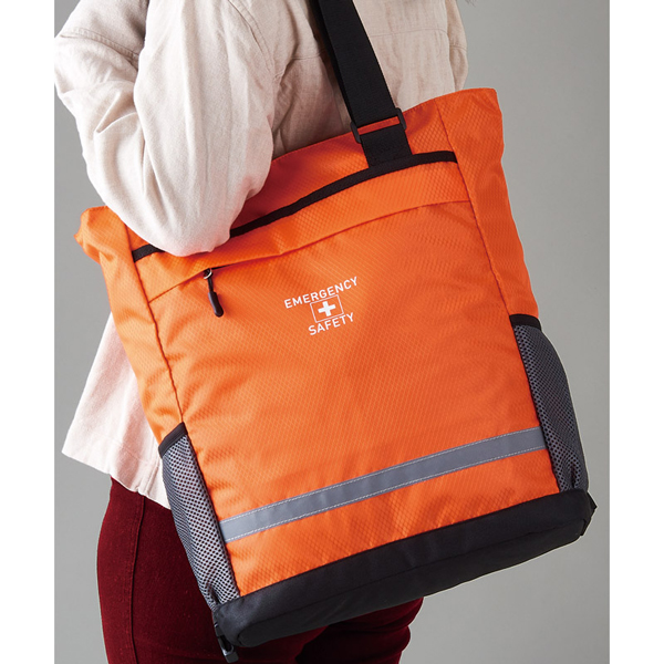 肩掛けトートも出来る2WAY仕様の避難用リュックに、各種防災グッズをセット。軽量・口広ファスナーで中に入っている物の取り出しもスムーズ。