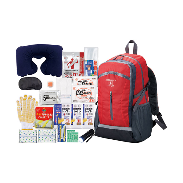 | 内容 | 避難用リュック(約200×300×515mm)×1、9光ライト・ホイッスル・ウェットティッシュ(20枚)・防寒アルミシート・軍手・エイトバン(大小×各2)・首枕・アイマスク・耳栓・マスク・ウェットボディタオル・給水袋(3l)×各1、ポケットティッシュ・使い捨てカイロ×各2、携帯トイレ(大小兼用)(1P)×3 |