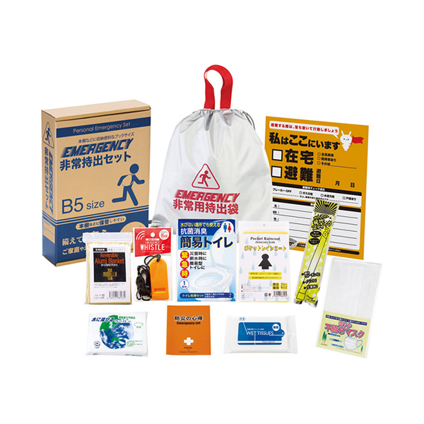 | 内容 | 非常持出袋(約340×300mm)×1、防災の心得・ホイッスル・レインコート・抗菌消臭トイレ・発光スティック・アルミブランケット・除菌アルコールウェットティッシュ・マスク・緊急避難カード・水に流せるペーパー×各1 |
