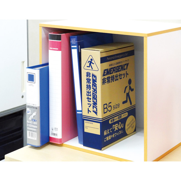 棚や引き出しに収納しやすいB5ファイルサイズの化粧箱に入った防災セット。