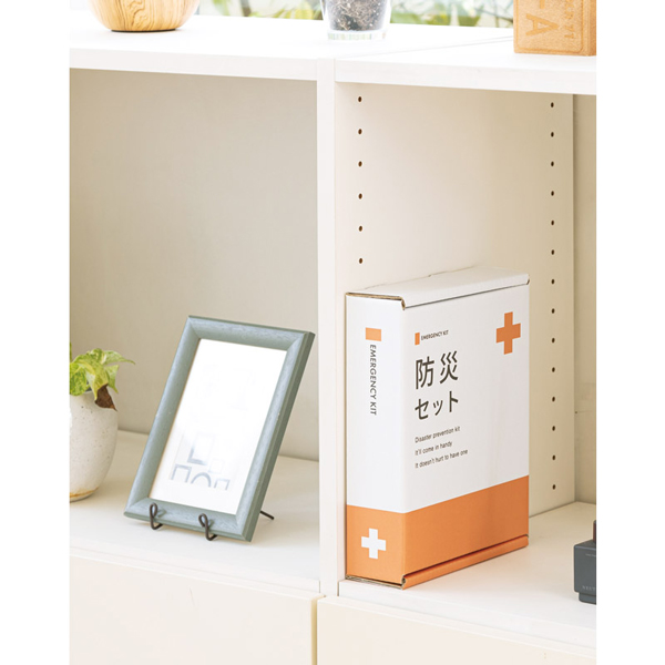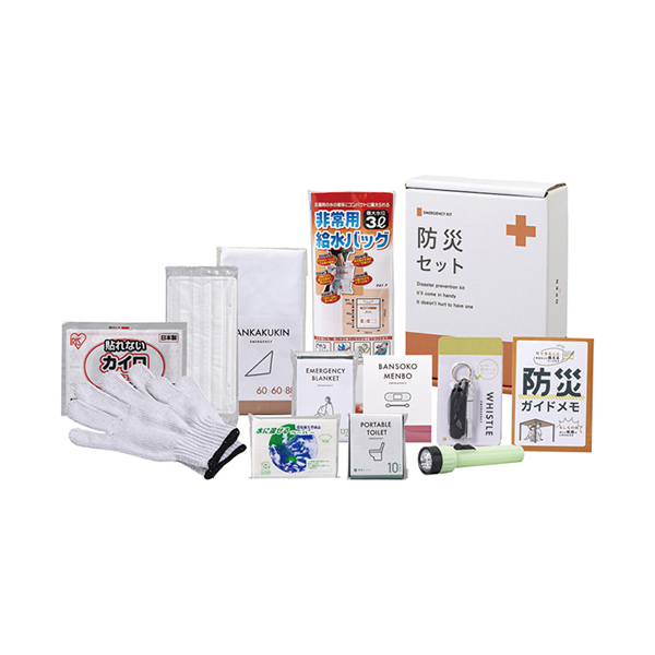 | 内容 | 水に流せるポケットティッシュ・携帯トイレ(1回分)・使い捨てカイロ・使い捨てマスク・防災ガイドメモ・非常用呼子笛(IDカード付き)・蓄光LEDライト・静音アルミブランケット・三角巾・軍手・非常用給水バッグ(3l)・絆創膏・綿棒セット×各1 |