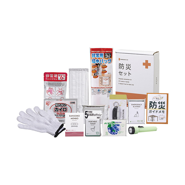 | 内容 | 水に流せるポケットティッシュ・携帯トイレ(1回分)・使い捨てカイロ・使い捨てマスク・防災ガイドメモ・非常用呼子笛(IDカード付き)・蓄光LEDライト・静音アルミブランケット・非常用ウェットタオル・軍手・非常用給水バッグ(3l)・絆創膏・綿棒セット・ウェットティッシュ(5年保存)×各1 |
