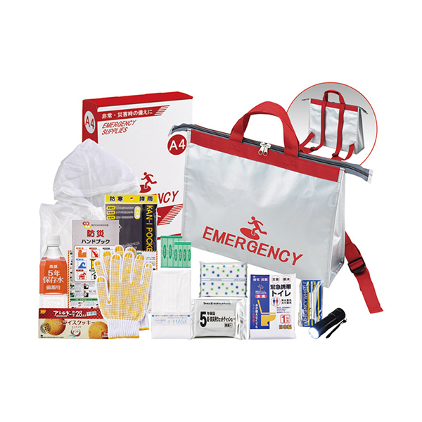 | 内容 | トートリュックバッグ(約100×370×295mm)×1、9光ライト・ホイッスル・携帯トイレ(大小兼用)(1P)・ウェットティッシュ(20枚)・ポケットティッシュ・防災ハンドブック・レインコート・軍手・エイトバン(大小×各2)・マスク・備蓄用飲料水(約500ml)・ライスクッキー×各1 |