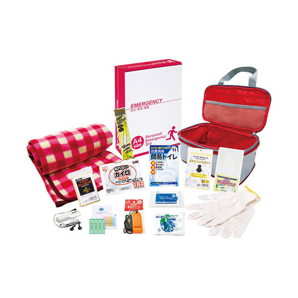 | 内容 | 圧縮収納バッグ(約180×270×125mm)×1、ホイッスル・マスク・軍手・アルミブランケット・フリースブランケット・発光スティック・綿棒&絆創膏・カイロ・レインコート・抗菌消臭簡易トイレ・FMラジオ・水に流せるペーパー・除菌アルコールウェットティッシュ×各1 |