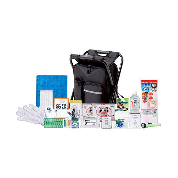 | 内容 | イス型リュック(使用時:約280×300×430mm/折畳時:約350×500×80mm/リュック時:約150×290×320mm)×1、非常用給水バッグ(3l)・蓄光LEDライト・アルカリ保存水(500ml)・使い捨てマスク・救急セット(エイドチーム2)・水に流せるポケットティッシュ・ウェットティッシュ・静音アルミブランケット・携帯トイレ(1回分)・非常用呼子笛(IDカード付)・軍手・防災ガイドメモ・チャック付き袋・ブルーシート×各1、使い捨てカイロ×2 |