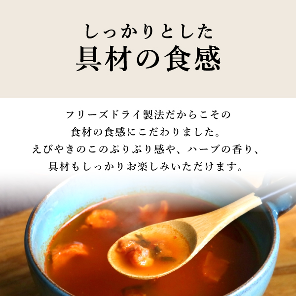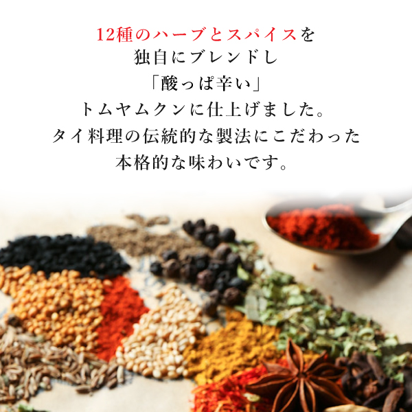 12種類のハーブとスパイスをしっかり混ぜ合わせ、自家製の発酵うま味調味料とタイ料理の伝統的で手間暇かけた製造方法にこだわって作った、本格的なトムヤムクンです。