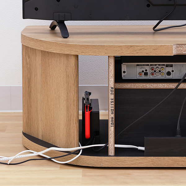 天板にも配線を通す加工があります。テレビなどの配線を後ろに通してすっきりまとめることが可能。背面には複数の電源コードをまとめられるようになっています。