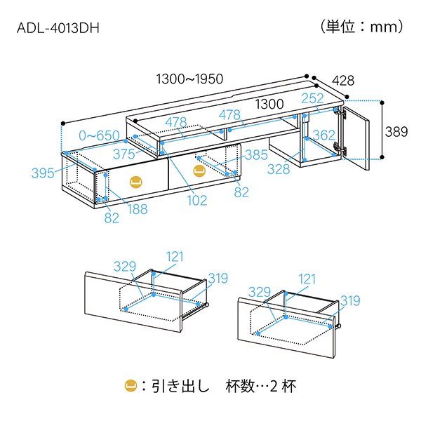 | サイズ | 幅1300〜1950×奥行428×高さ389mm |