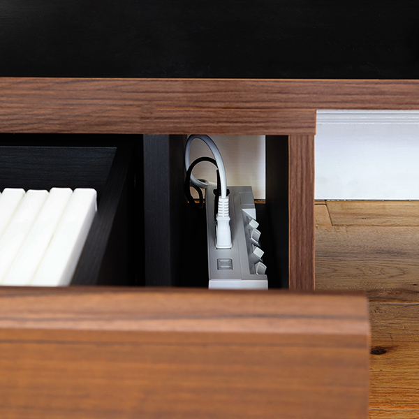 地板とオープン棚や扉・引き出しの内側は黒木目になっています。アクセントの黒色が高級感を引き出してくれます。