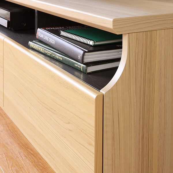 天板はやわらかなラインと趣のある木の質感が特長です。取っ手のないフラットな引き出しで無駄のないすっきりとしたデザインです。