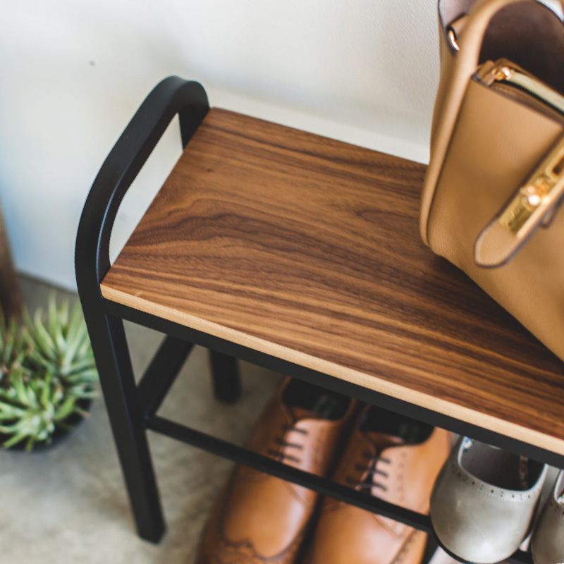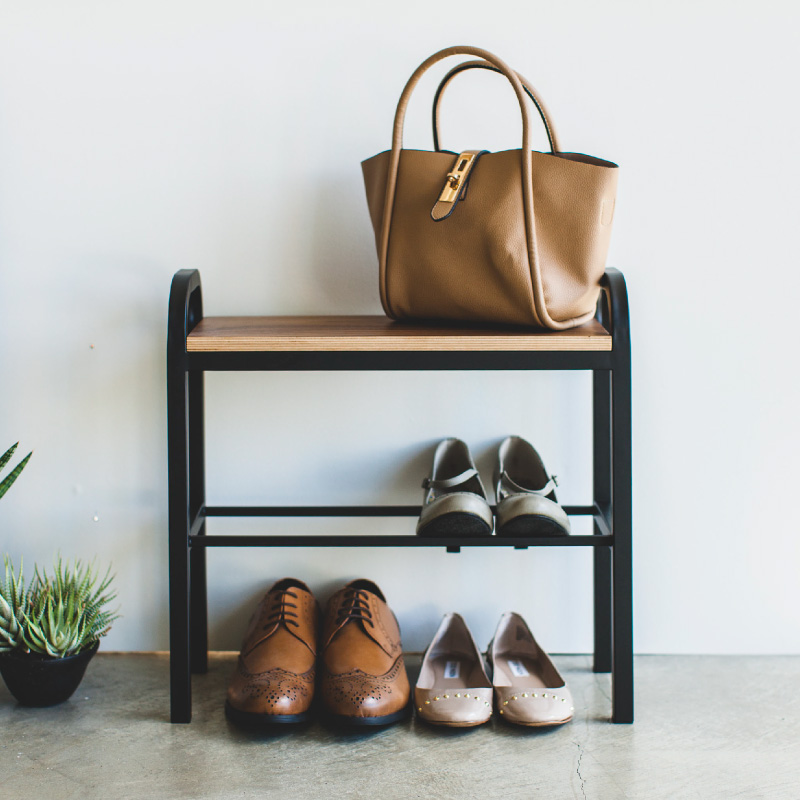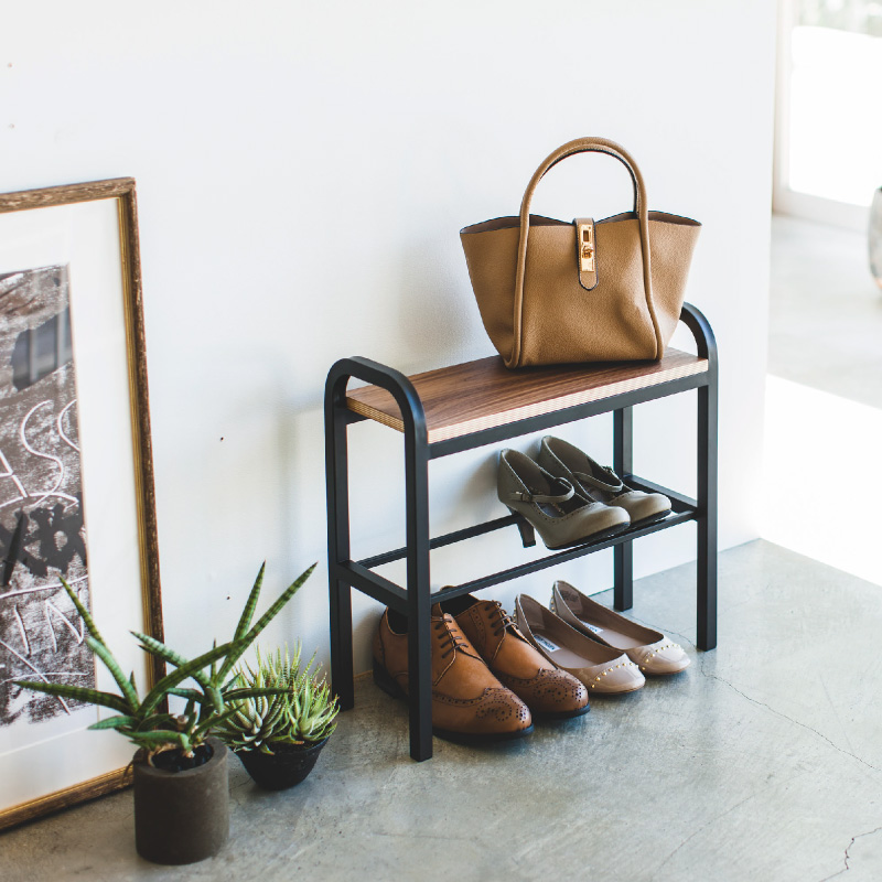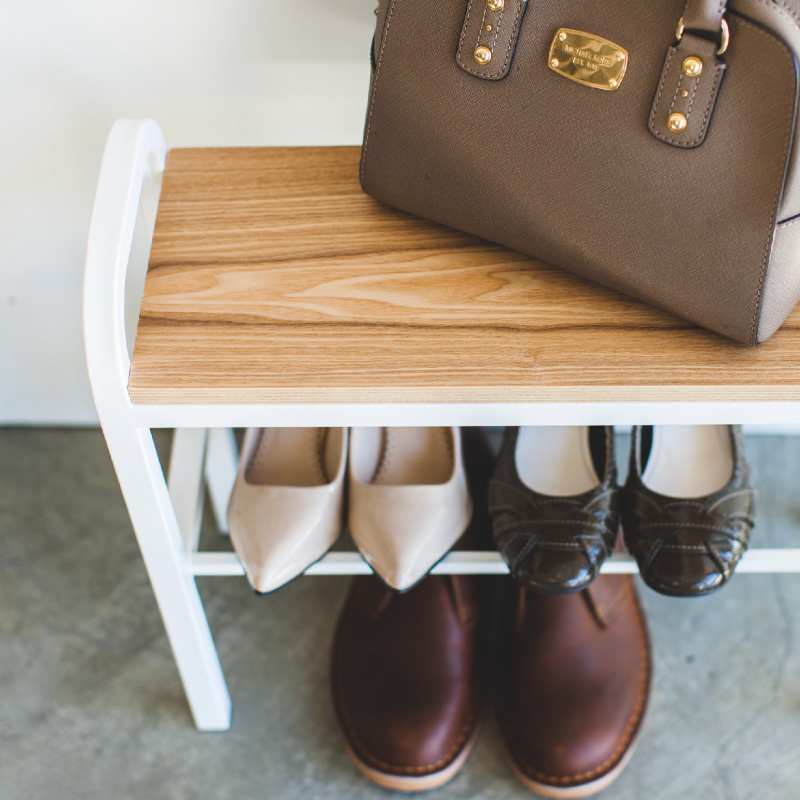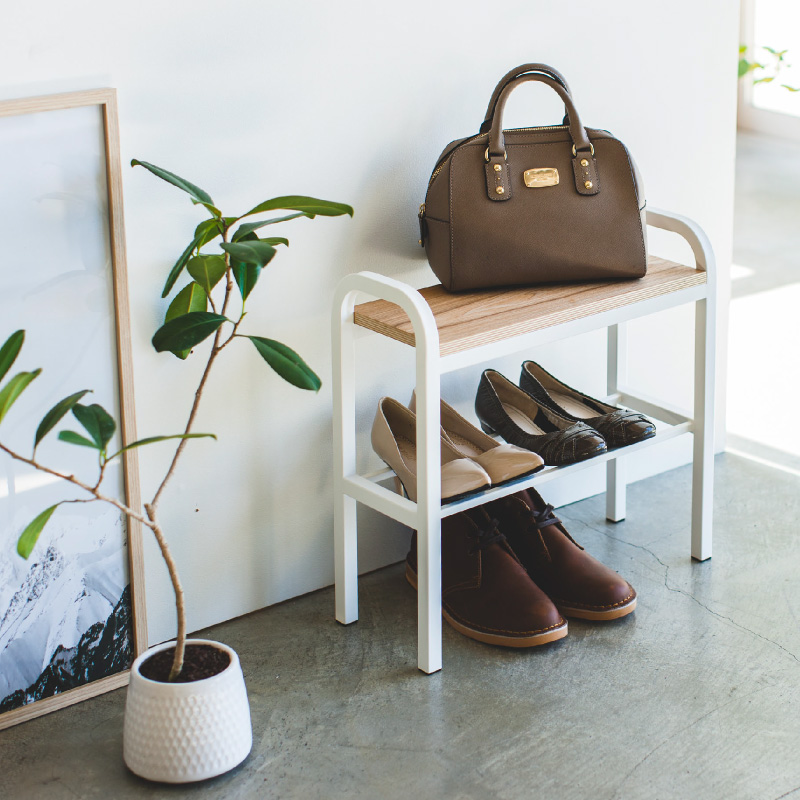 靴の着脱、荷物置きとしてはもちろん、ハンドル付きだから立ち上がりやすいベンチです。座面の下には大人の靴を最大4足収納できます。お出かけ前やご帰宅時の靴の着脱、荷物置きに便利!木の座面が上品なベンチシューズラック。