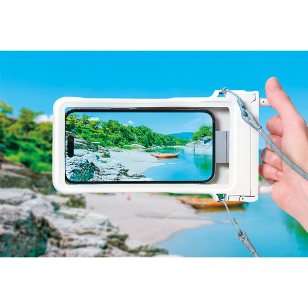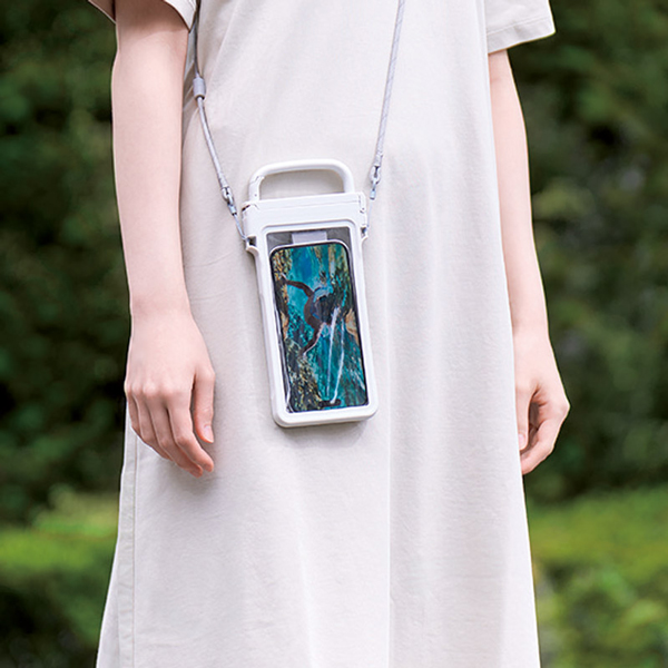 持ち運びやすく撮影しやすいハンドル付きカラビナ防水ケース。スマートフォン操作画面と防水ケース操作用窓の間に空気の層を作り、水中でもタッチ操作、カメラ撮影が可能です。水辺のレジャーやアウトドアなど大切なスマートフォンを守ります。■対応サイズ:高さ137〜163×幅79×奥行9mm以内■防水性能:IP67相当