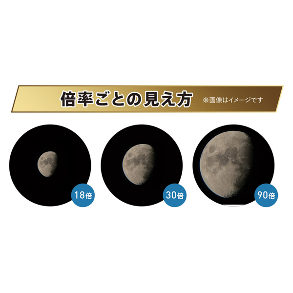 天体観測も地上観測もできる望遠鏡です。スマートフォンアダプターを取りつけて写真や動画も撮影できます。アイピースは3個付属しており、倍率を18倍・28.8倍・90倍と変更して楽しめます。天体ガイドブック・星座早見盤付。