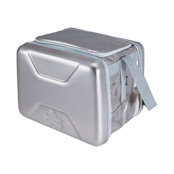 ハードクーラーの保冷力とソフトクーラーの収納性を兼ね備えた高性能保冷バッグ。■ペットボトル500ml16本収納可。■表面は太陽光を反射するメタルシルバーカラー。■外部の衝撃から瓶類を守るシェルプロテクト構造。
