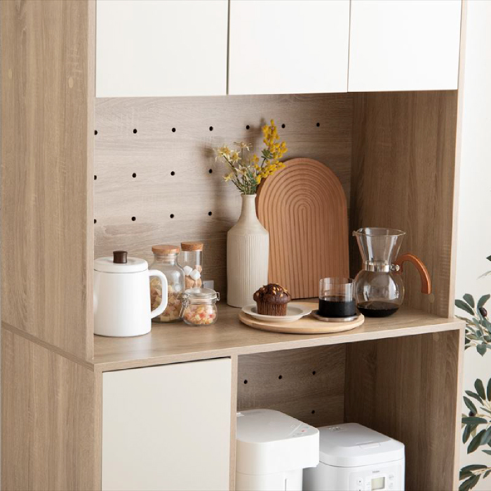 オープン収納は、家電やキッチン雑貨など使用頻度が高いものを置くのに最適。木目調とバイカラーのシンプルなデザインが、お気に入りのキッチン雑貨をインテリアの一つとしておしゃれに惹き立ててくれます。
