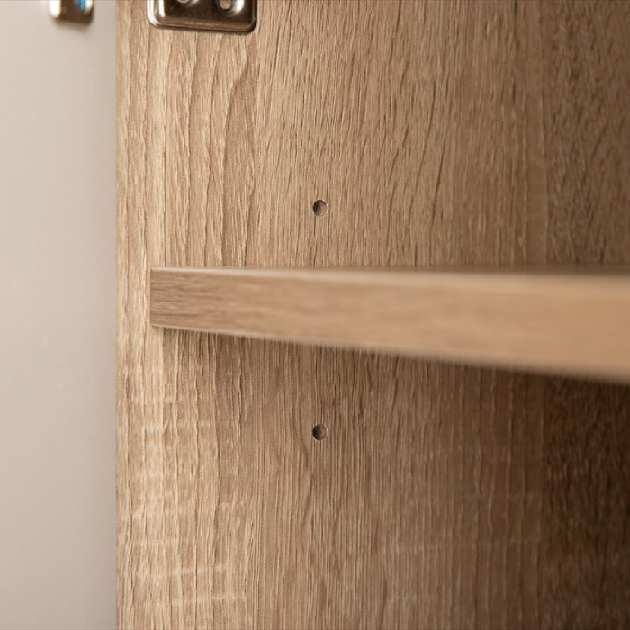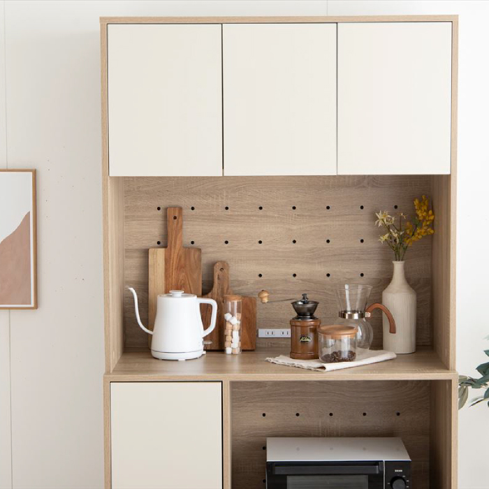 一台で5タイプの収納を完備しており、あらゆるサイズの食器や調理用品をすっきりまとめて収納可能。棚板調整が可能な部分は、お持ちの食器などによって高さを調整していただき、無駄なく最適なスペースを確保していただけます。