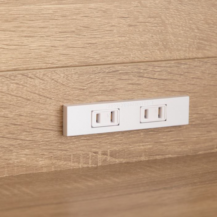 さらに炊飯器や電子レンジを収納できるスライド収納には嬉しい2口コンセント付き!家電を2つゆったり並べて収納していただけます。