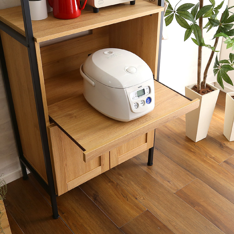 出し入れしやすいスライドトレーには2口コンセントがついており炊飯器など置くのにピッタリです。