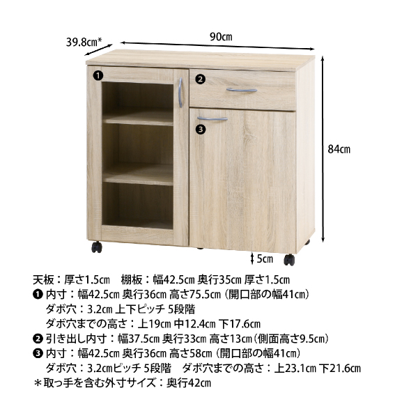 | サイズ | ■本体サイズ:幅900×奥行398×高さ840mm ■天板厚み:15mm ■引出内寸:幅375×奥行330×高さ95(130)mm |