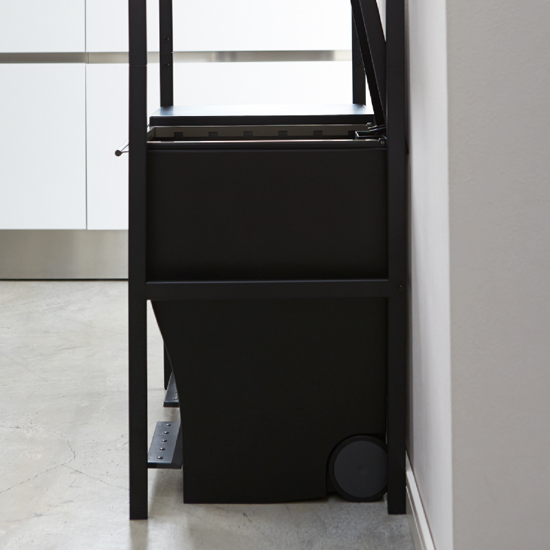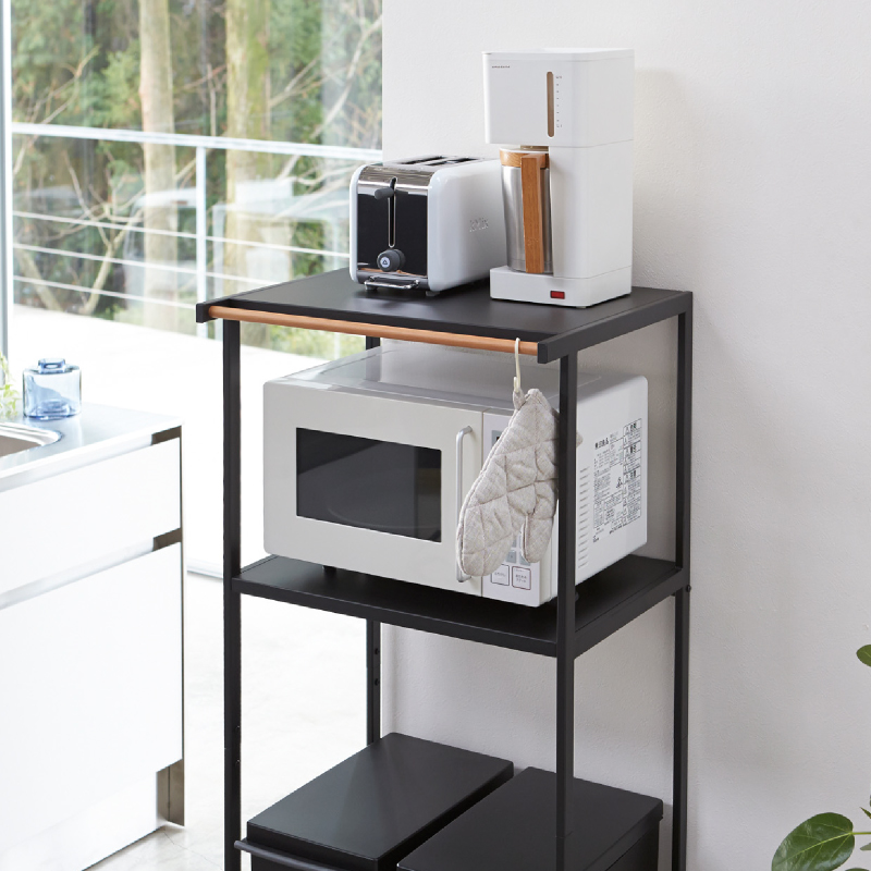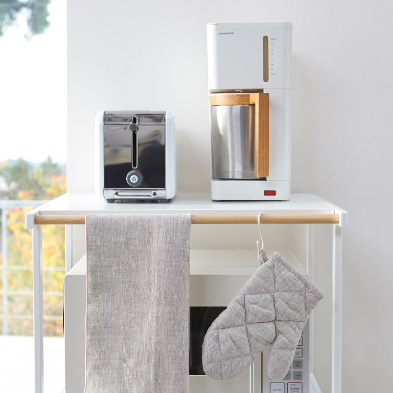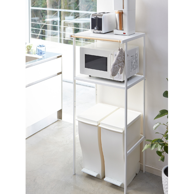 ペダル式のゴミ箱の上を有効活用できるラック。蓋をあけてもぶつかりません。ペダル式のゴミ箱がすっぽり収まるサイズ。便利な多目的バー付き。布巾や鍋つかみを掛けておくのに便利。電子レンジ・炊飯ジャー・トースター・コーヒーメーカーなどが置ける便利なラック。