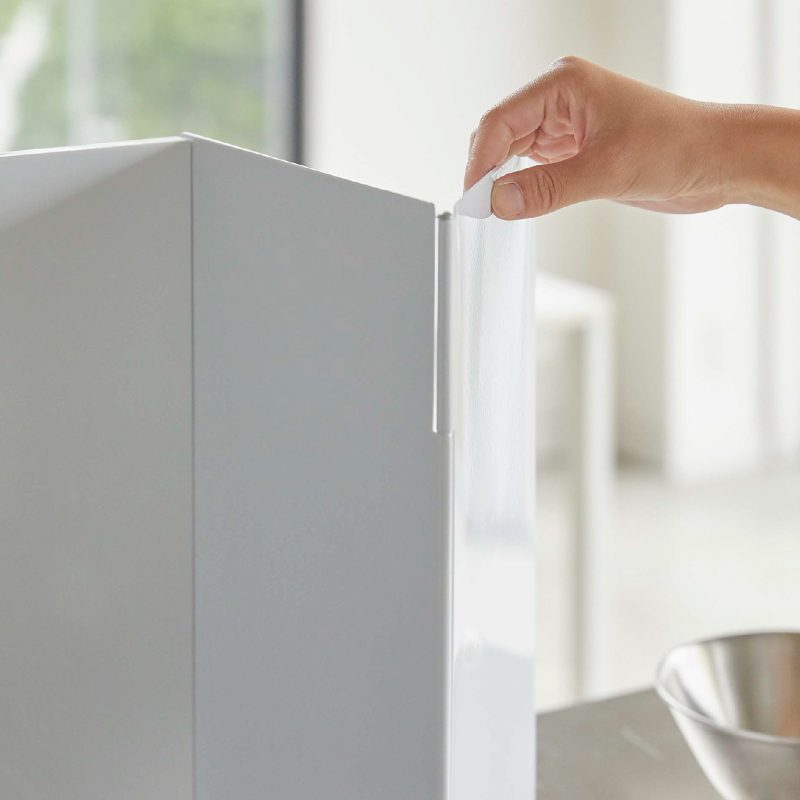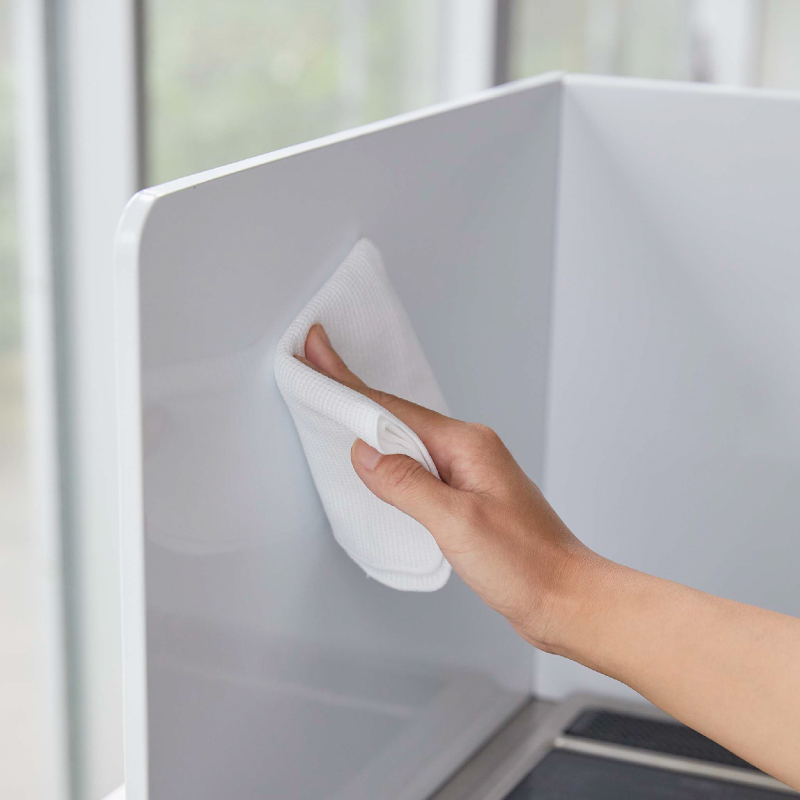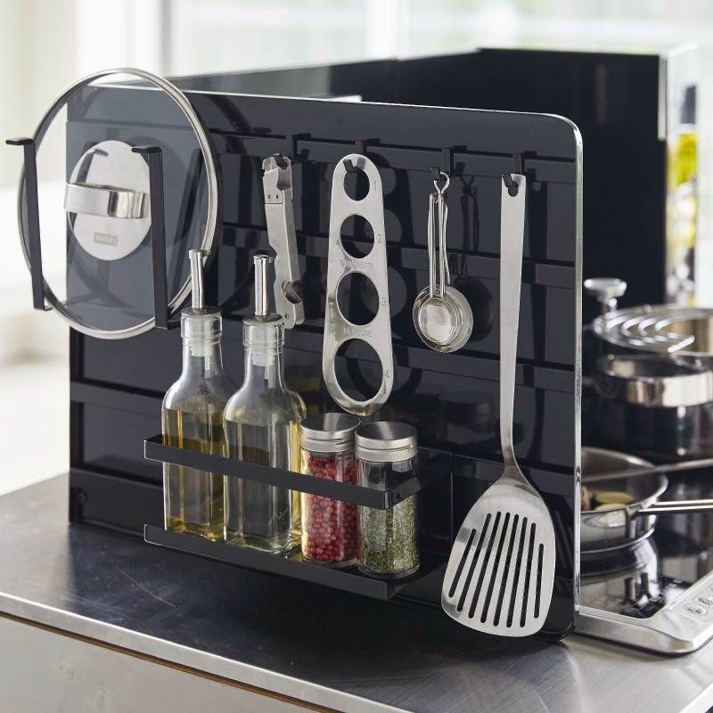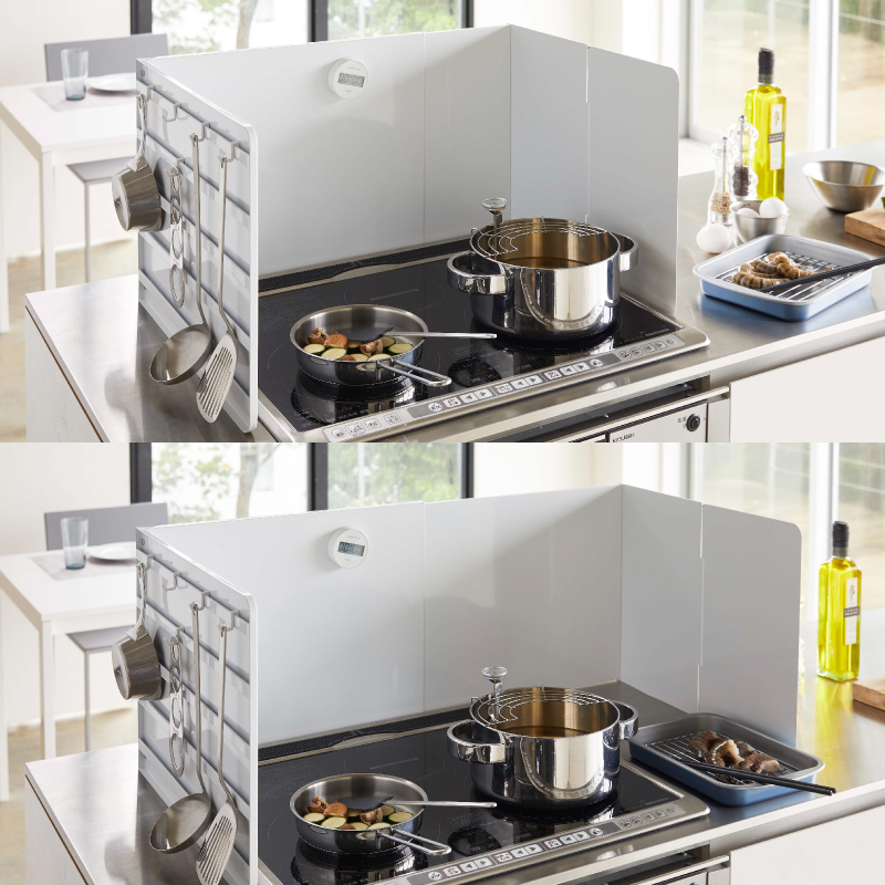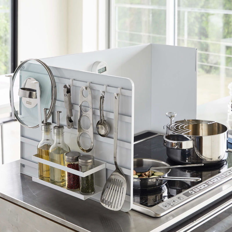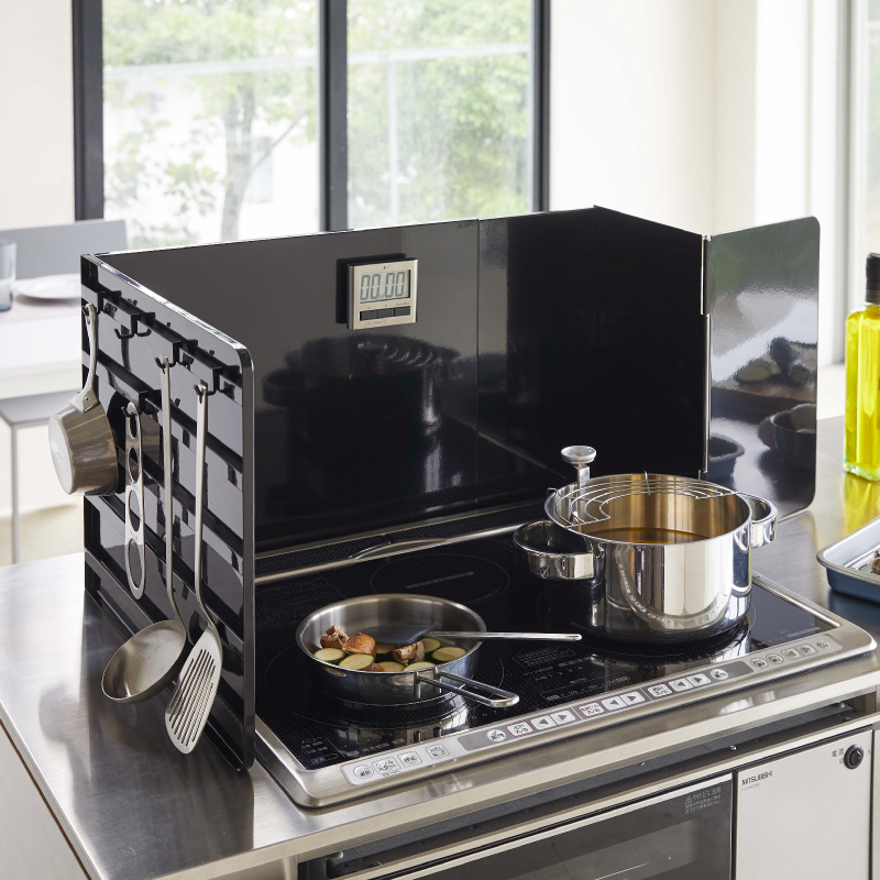 レンジのサイズに合わせて伸縮できる伸縮レンジガード。調理中の油はね・拭きこぼれをガードしてくれます。凹凸のないフラットな設計だから油汚れもサッとひと拭きできてお手入れも簡単です。収納付きパネルには別売りの収納ツールを自由に取り付けてアレンジ自在!