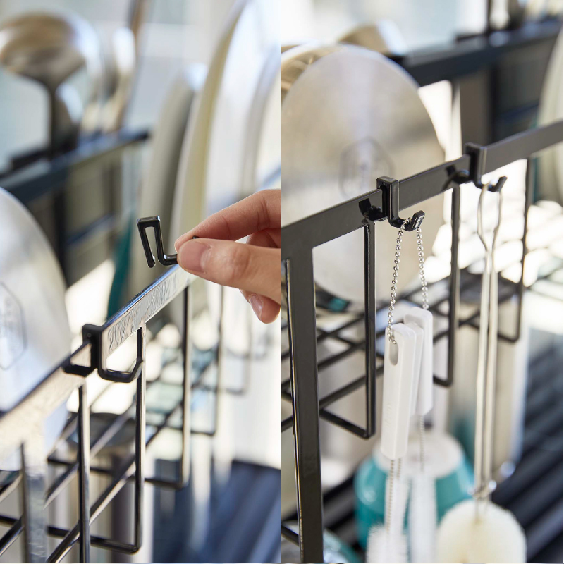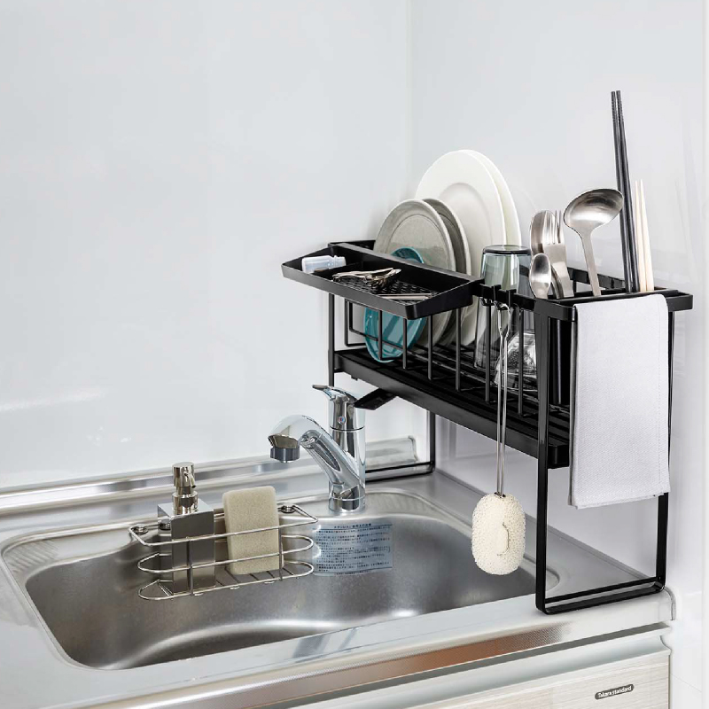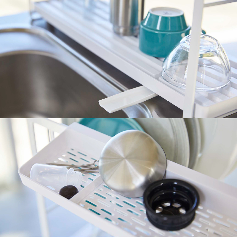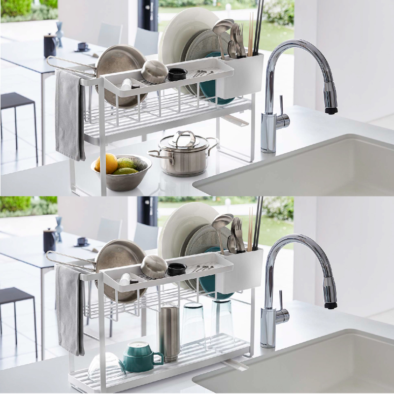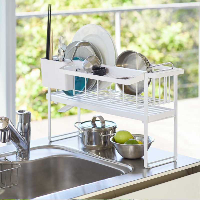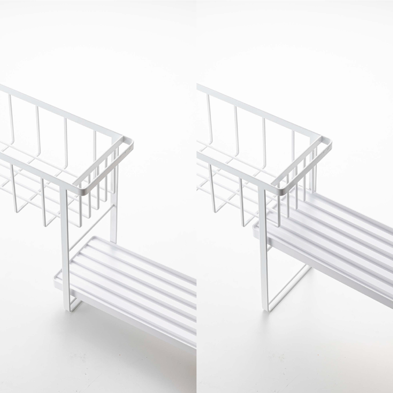 シーンに合わせて使い方様々!スリムな水切りワイヤーバスケット2段。大容量の2段水切りとして。収納量が欲しい方に。内側のスリットを利用してお皿や鍋フタも立てられます。上段にすれば調理台に置いても使いやすい仕様に。スリムなので調理の邪魔になりません。ハンドルには布巾を掛けることもできます。水切りトレーと分けて違う場所で使用することができます。ワイヤーバスケットはシンクに渡らせて使用することもできます。
