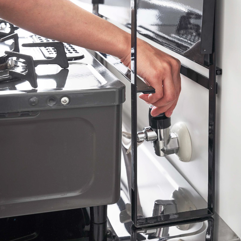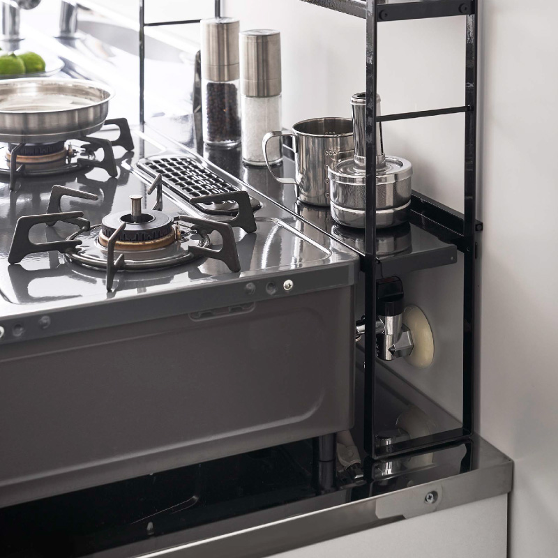 コンロ奥の隙間に置くだけ!油はねや調理汚れをしっかりガードしてくれる2段ラック。 調理道具やスパイスなどがたっぷり収納でき、ビルトインタイプのコンロ周りのラックとしても使えます。 棚板が上に開くので、設置したままガスの元栓の開閉が可能。