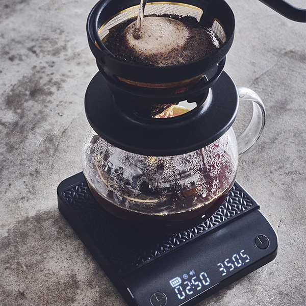 ハンドドリップにこだわるコーヒーラバーに向けて開発した、コーヒースケール。僅かな差異が測れる0.1g単位表示と、お湯を注いだ瞬間から時間計測が始まるオートタイマー機能付き。本体表面が濡れても安心のIPX4基準を満たした防水仕様。耐熱100℃のシリコンパッドを使用すれば、熱めのコーヒーサーバーを置いても大丈夫。キッチンスケールとしても日常使いできます。