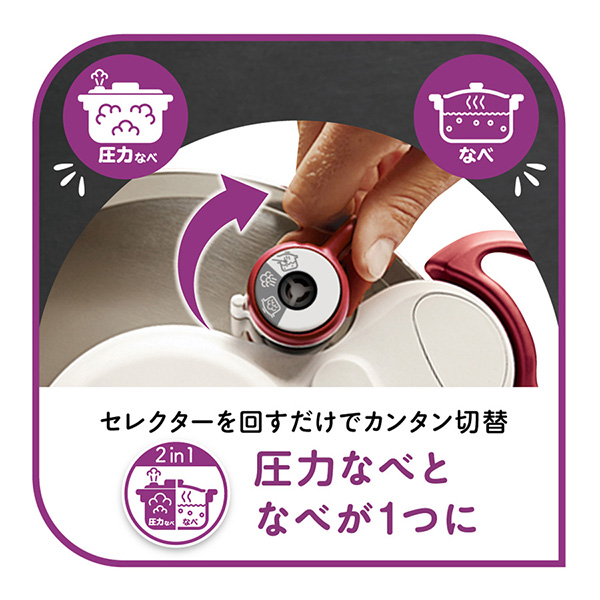 セレクターを回すだけで、圧力鍋としても、鍋としても使えます。