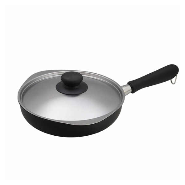 柳宗理のデザインは利き手を問わず注ぎやすいように左右に張り出した注ぎ口があり、蓋を回転させることによって吹きこぼれを防いだり、蓋で中身を抑えて隙間から湯切りしたりできます。本体の素材に、マグマプレート材を採用しています。鉄の表裏両面に細かな凹凸を浮き立たせたマグマプレートは油なじみがよく、食材とランダムな点で接触するので、こげつきやこびりつきを軽減します。油なじみのよさは鉄製品の弱点とされるサビの発生も抑えます。フッ素などのコーティングがないため、鉄フライパンならではの耐久性があり、金属製ツールの使用や強火での使用も可能で、調理を存分にお楽しみ頂けます。