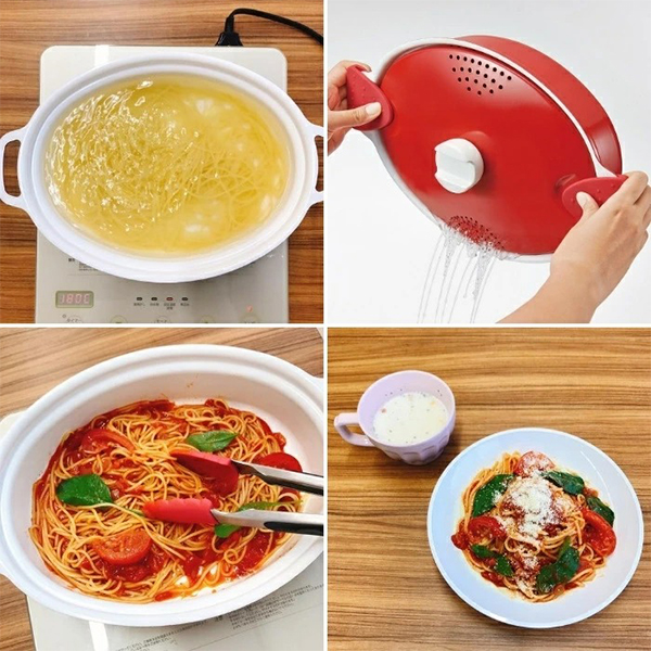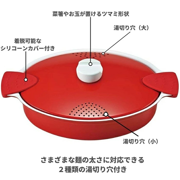 蓋を付けたまま湯切りでき、ザルいらずで便利。着脱可能なシリコーンカバー付き。