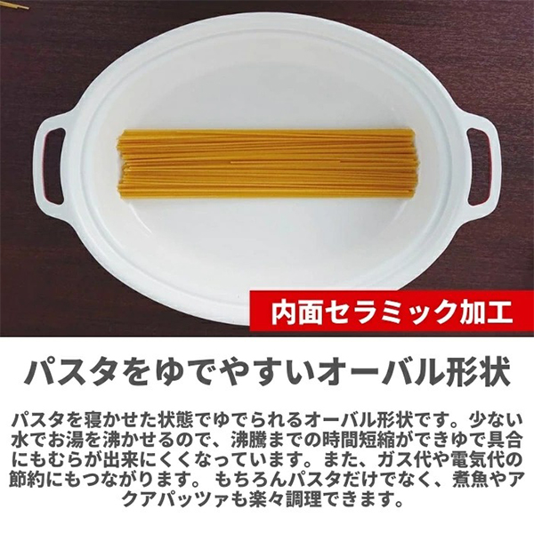 パスタを寝かせたまま茹でられるオーバルパン。少ない水で沸騰し時短調理が可能です。