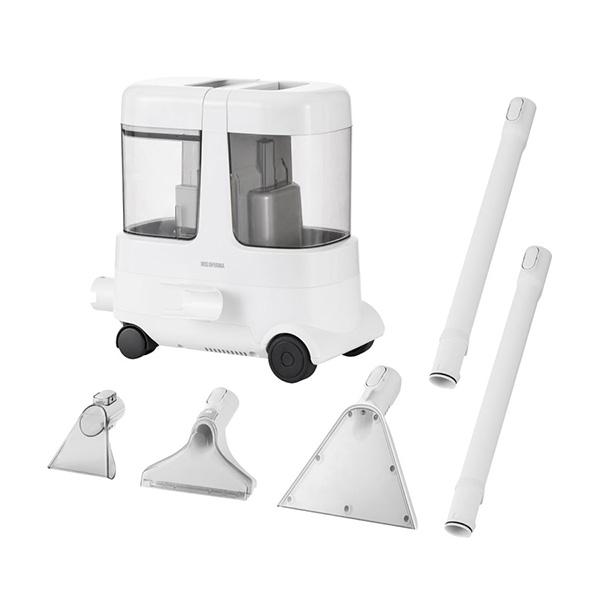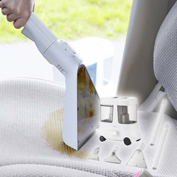 布製品を丸ごと洗浄できるリンサークリーナーです。15kPaのパワフルな吸引力で、布製品に付いた様々な汚れを落とすことができます。大容量タンク(回収タンク約1.6L、清水タンク約1.8L)なので広範囲を洗浄可能です。タンクの容量アップにより汚水の処理と清水の補充の回数が減少しました。延長パイプ付きのフロアノズルで、屈むことなく掃除ができます。キャスター付きで、180°方向転換も可能です。3種類のアタッチメント(飛び散り防止ヘッド、ブラシ付きヘッド、フロアノズル)でお掃除がスムーズにできます。