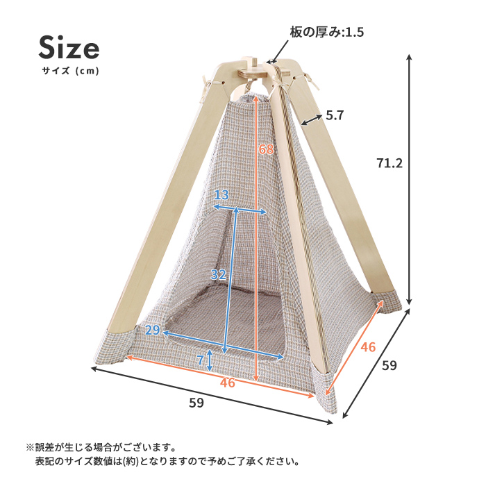| サイズ | ■本体サイズ:約幅59×奥行59×高さ71.2cm ■テント内寸:約幅46×奥行46×高さ68cm |