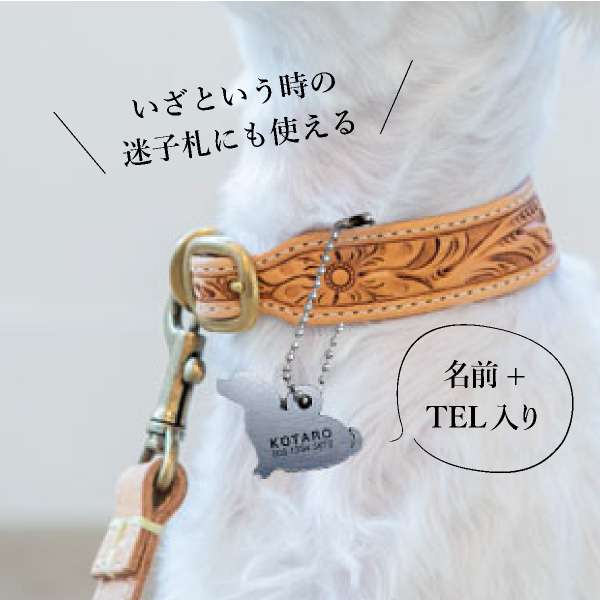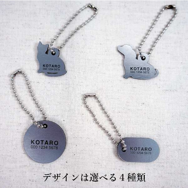 ペットのお名前と、電話番号が入るタグです。電話番号入りなので迷子札としてもご利用いただけます。デザインは選べる4種類♪