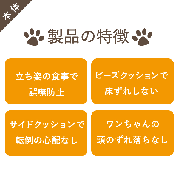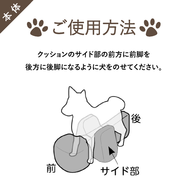 高齢等、四肢が弱まったワンちゃんを立位保定する姿勢サポートクッション。立位での食事が可能となり、誤嚥防止につながります。看護者による様々な保定負担を軽減します。動物病院でリハビリ、マッサージ等に使われている姿勢サポートクッションをより手軽にお使いいただけるよう、生活空間に合わせて色を選べるビーズクッションでご用意しました。セットの専用カバーは、汚れが染み込みにくいはっ水性。繰り返しお洗濯ができ、お気に入りのクッションを清潔に保てます。