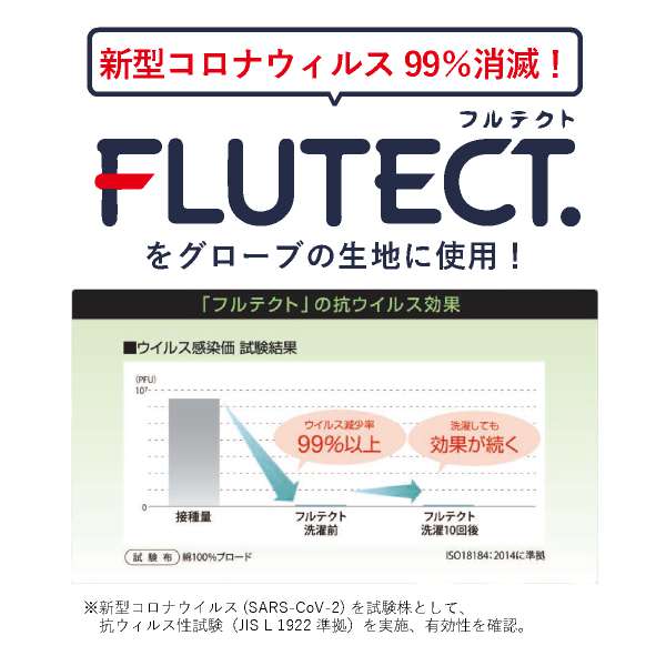 円抗ウイルス加工「FLUTECT(フルテクト)」は繊維上の特定のウイルスの数を減少させます。